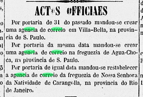 Foram encontrados dois anos de origem para os correios locais. Primeiro em 1854, conforme comunicado pelo filatelista Mario Celso Orsi Jr. Depois, em março de 1865, como noticiado pela imprensa carioca: